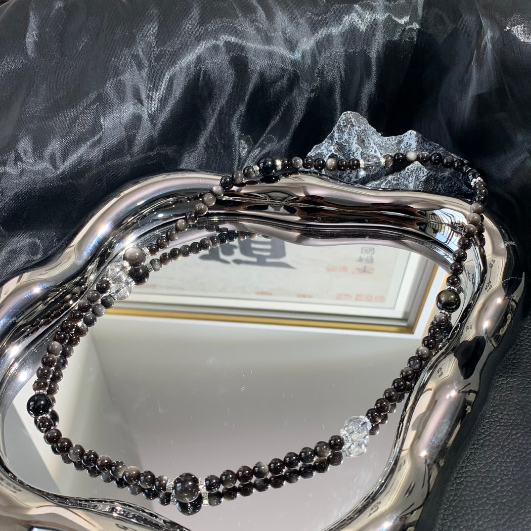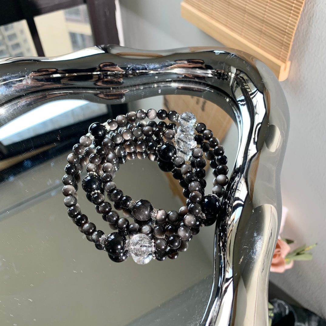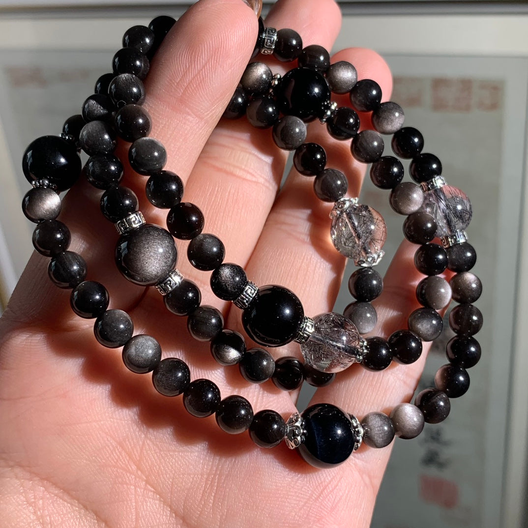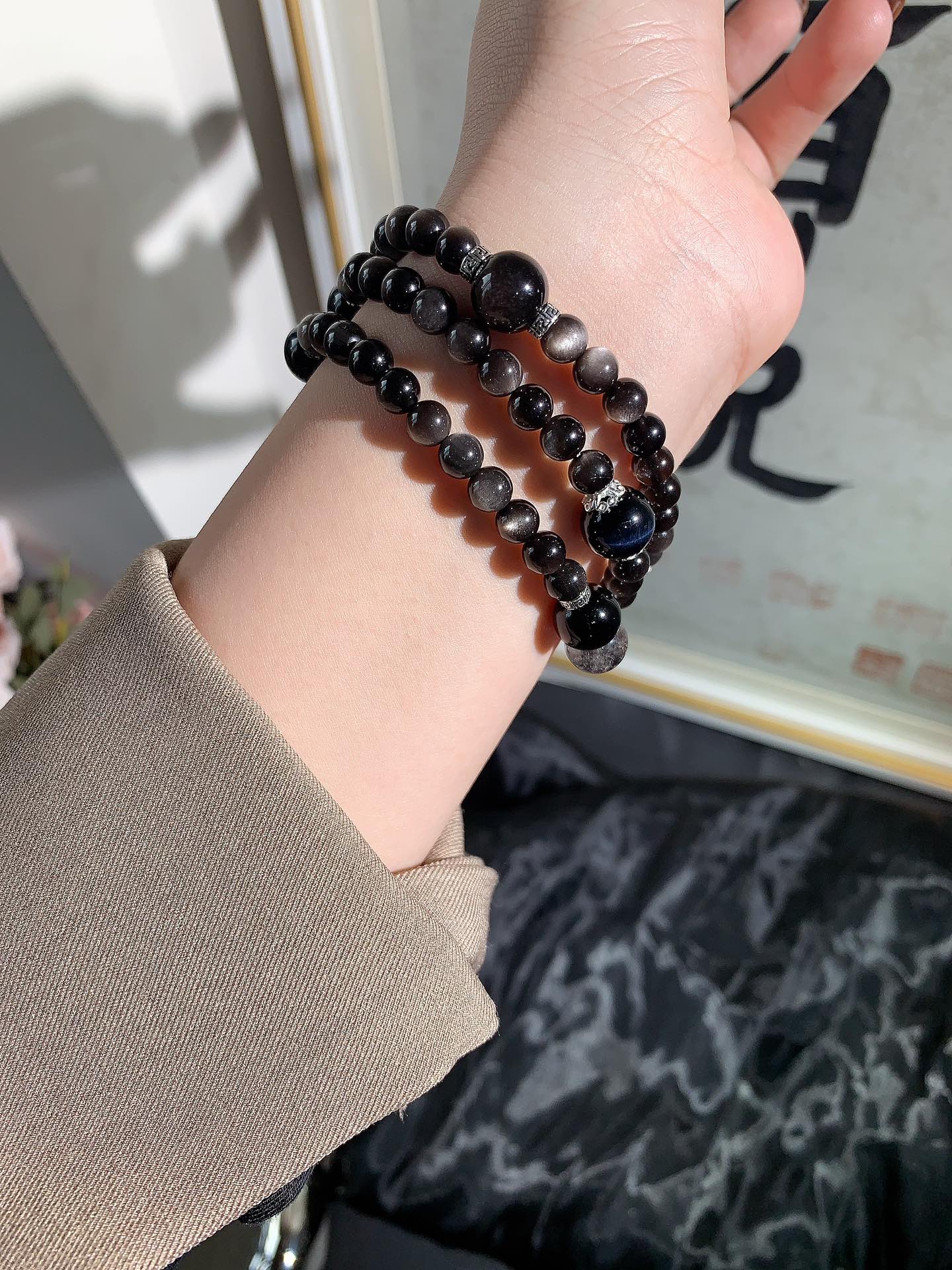 Three-layer bracelet/925 Silver, Obsidian, Silver Sheen Obsidian. It can ward off negative people, illness, turbid qi, and evil, and helps with sleep and entering the land of dreams. Obsidian has a stable and tranquil magnetic field, continuously soothing emotions and repelling evil. In addition to repelling evil, absorbing negative energy, and ensuring safety, Silver Sheen Obsidian can also attract wealth, being the premium variety among Obsidians. It can strengthen beliefs and confidence, enhance courage and decisiveness, and restore energetic balance, belonging to the rare varieties of the Obsidian family!