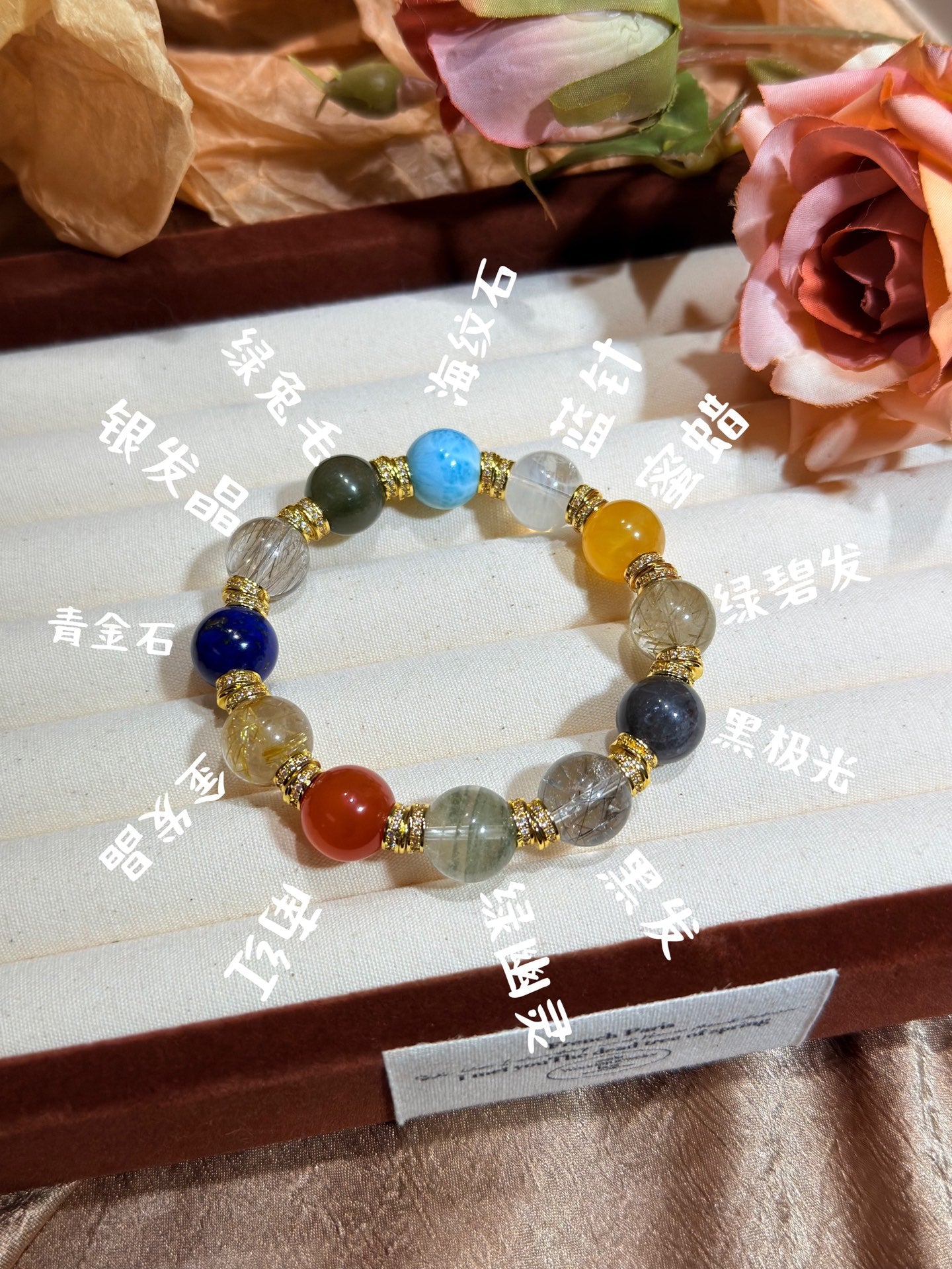 多宝手串 海纹石 / 蓝针 / 青金石 / 绿碧发 / 金发晶 / 银发晶 / 绿兔毛 / 蜜蜡 / 黑极光 / 南红 / 绿幽灵 / 黑发晶