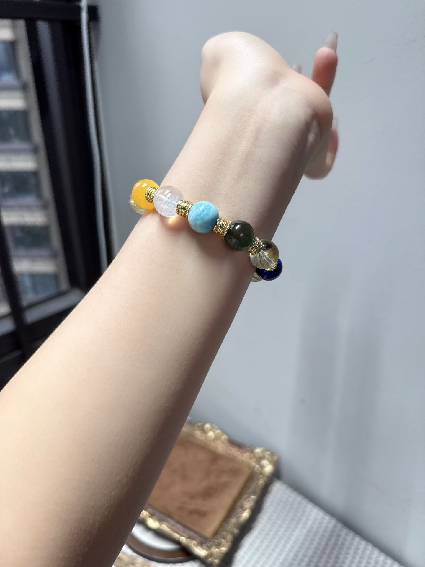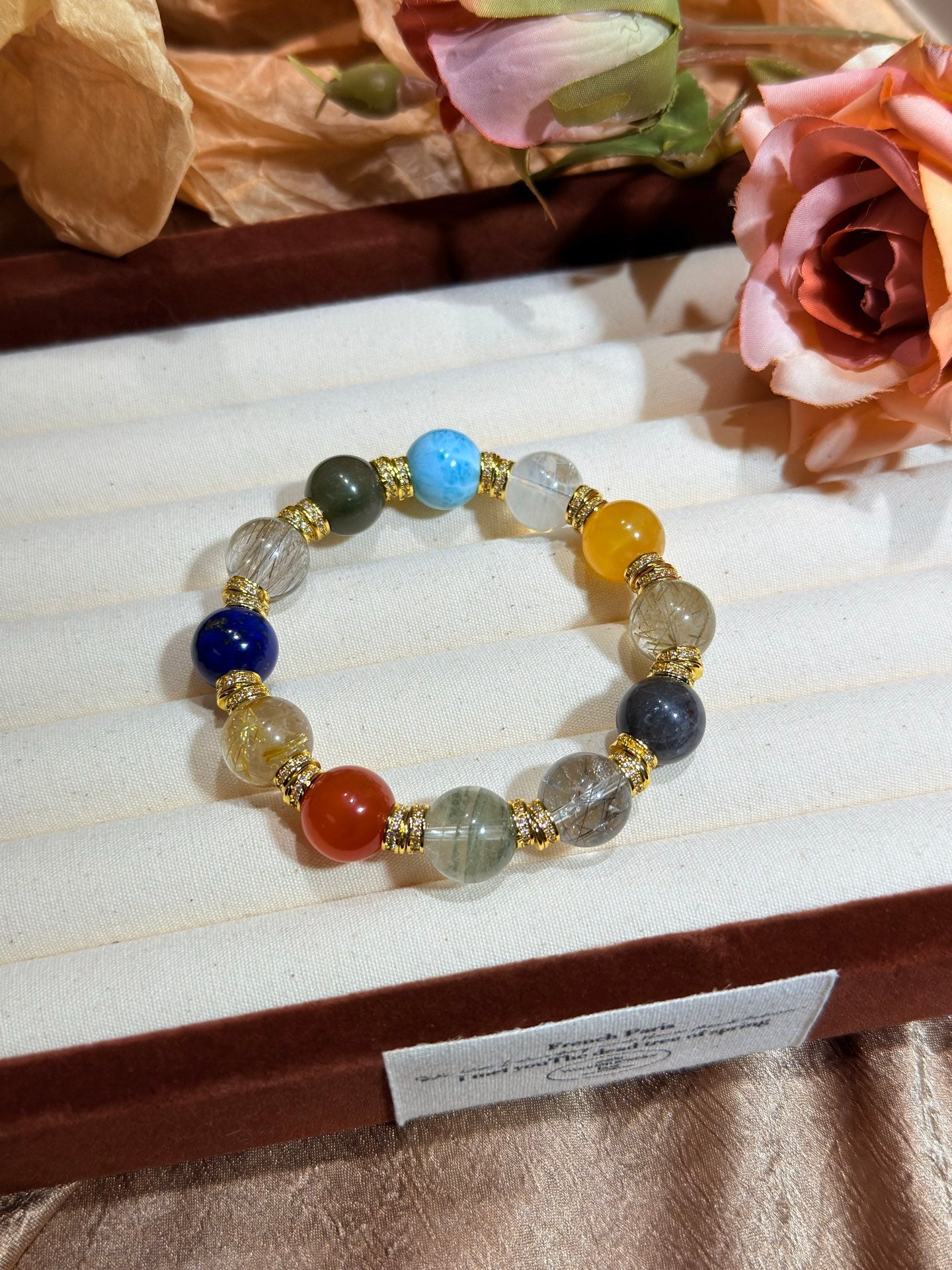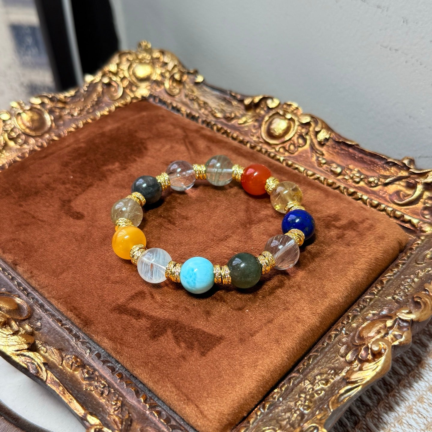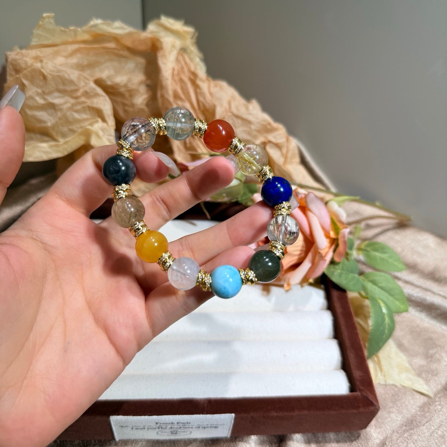 Multi - gem Bracelet / Larimar / Blue Needle Quartz / Lapis Lazuli / Green Tourmalinated Quartz / Golden Rutilated Quartz / Silver Rutilated Quartz / Green Angel Hair Quartz / Amber / Black Obsidian / South Red Agate / Green Phantom Quartz / Black Tourmalinated Quartz