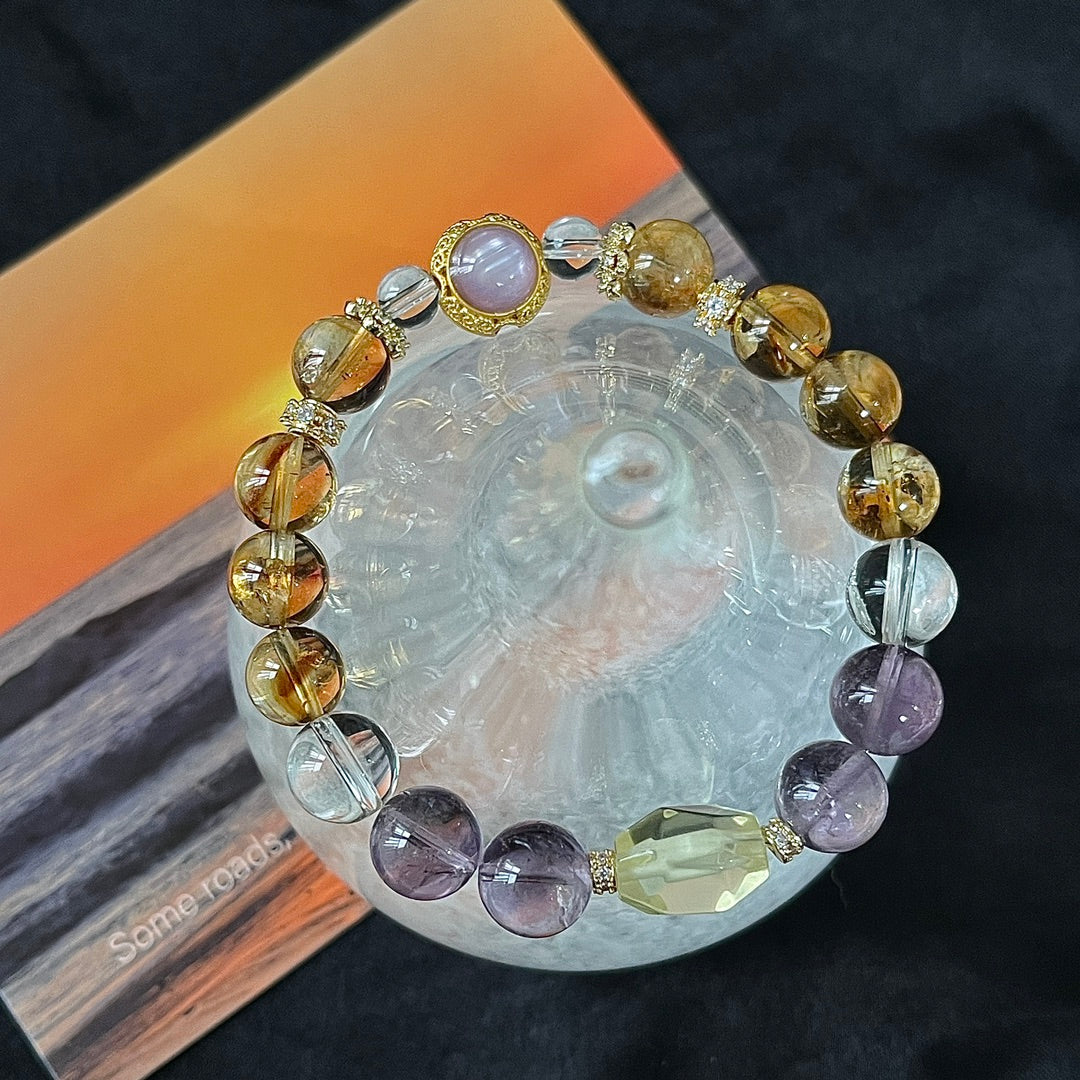 能量平衡循环(柠檬黄水晶的活力激发 × 紫兔毛的情感滋养 × 黄塔晶的财富吸引 × 白水晶的纯净调和)