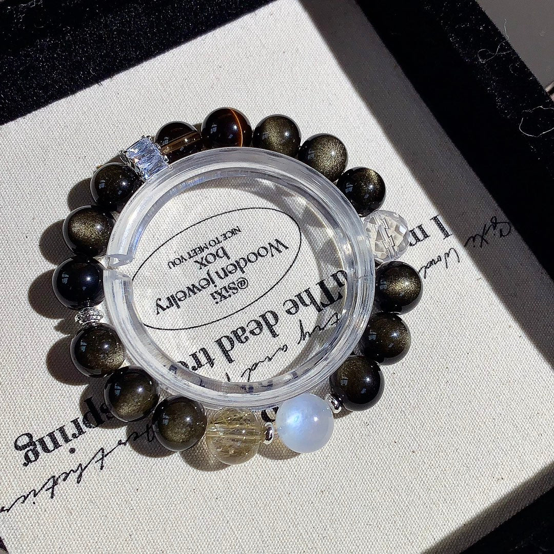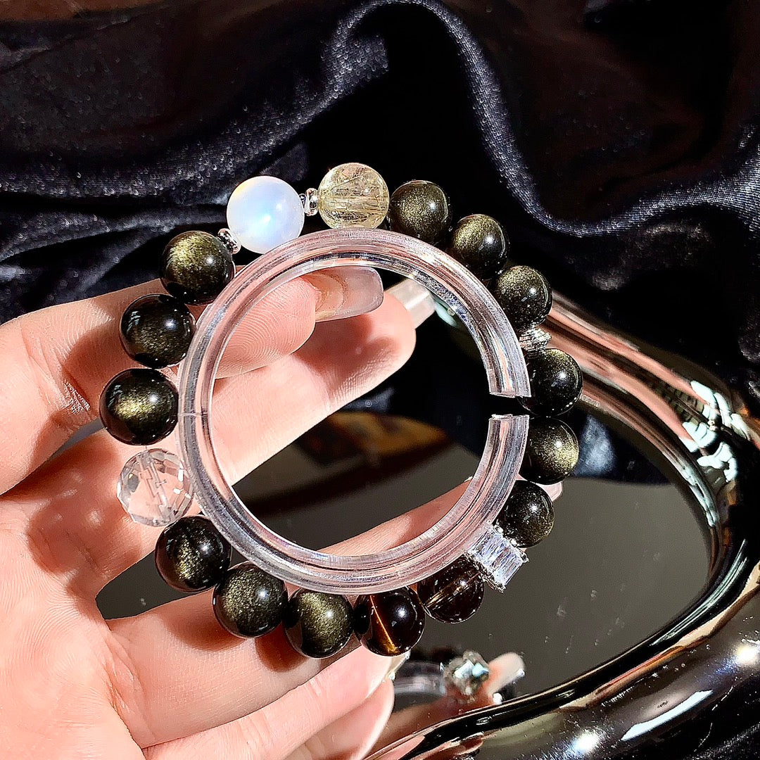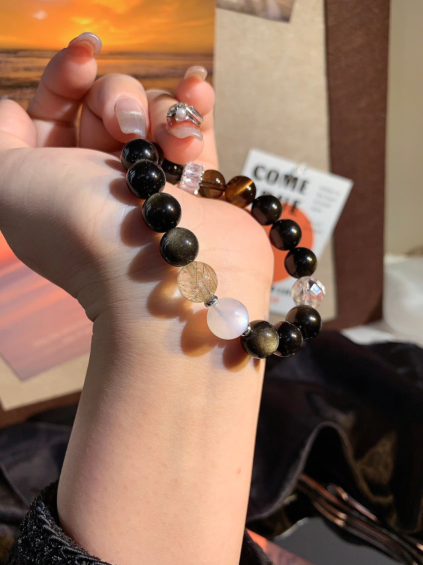Gold Sheen Obsidian / Blue Moonstone / Smoky Quartz / Yellow Tiger Eye / White Quartz / Golden Rutilated Quartz, each 10M with double eyes and golden sheen, Obsidian, Silver Sheen Obsidian
