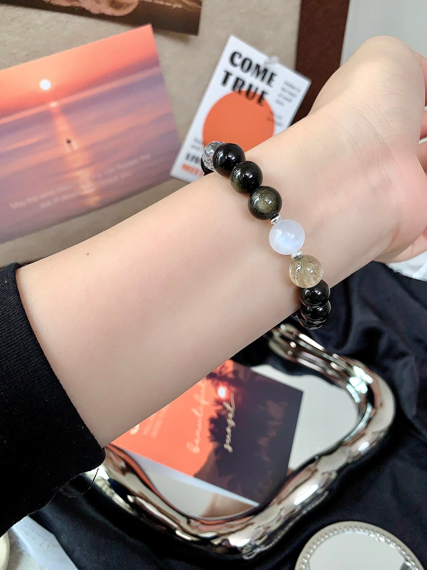 金曜 / 蓝月光 / 茶晶 / 黄虎眼 / 白水晶 / 金发晶 10M 每颗双眼带金 黑曜石、银耀石